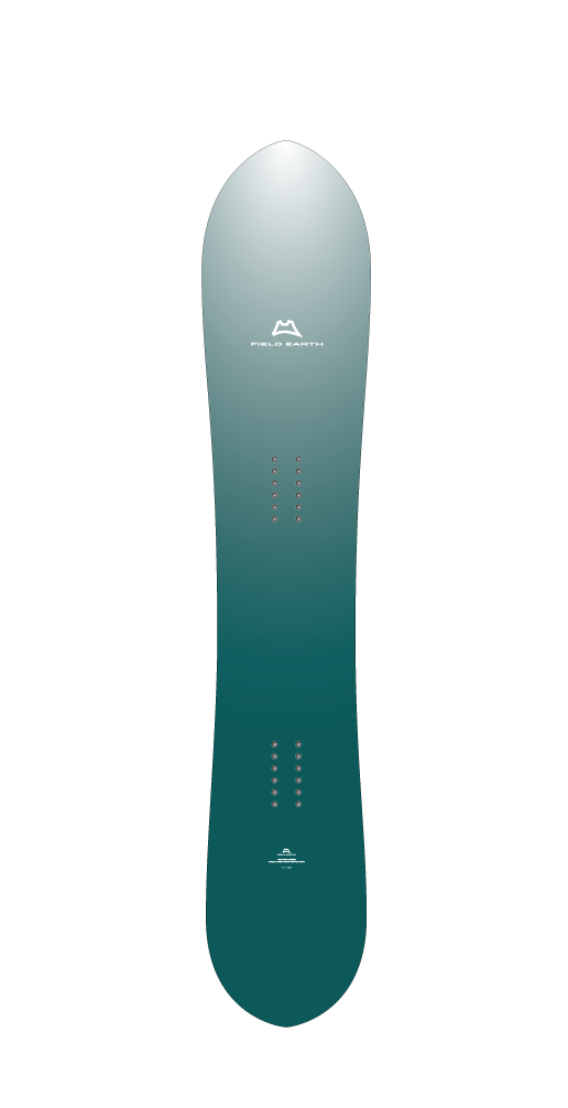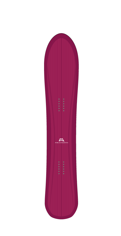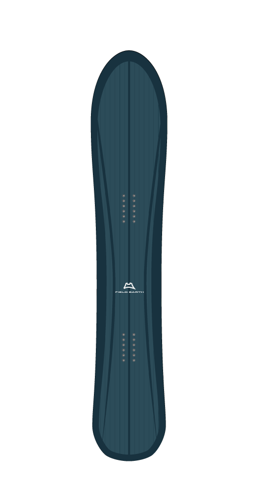 LシリーズはFIELD EARTH特有のバンブービーム+ウッドコアで形成されており、トーション方向を強めに調整しています。デッキ面エッジサイド側のコアを薄くし、粘りのあるトーションをデザインすることで、パワーの伝達をより正確に行います。また、長めの接雪長に2.5D形状を採用することで、しっかりとキャンバーに踏み込みながらエッジコンタクトを確保し、圧雪やパウダーでの板の切り返しも滑らかでスムーズに行えます。Lシリーズは直進性にも優れ、粘りのあるトーションを持っています。フリーライディングやカービングを徹底的に追求するには最適なモデルです。